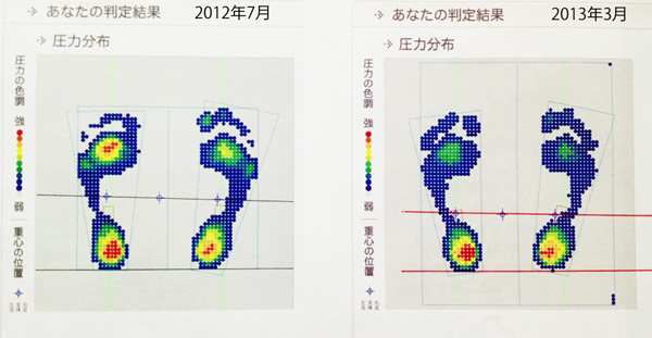 2012年7月の段階では、浮き指とはいえないまでも指に体重が十分に乗っているとは言えない状態でした。今年の3月では指のみえかたが明らかによくなり、前足部分の圧力集中が弱まっています。その影響か接地エリアという値が上がっています。左足(366ー>405)左足(394ー>408)この数値の左右差があまりなくなっているというのもすごくいい兆候だそうです。