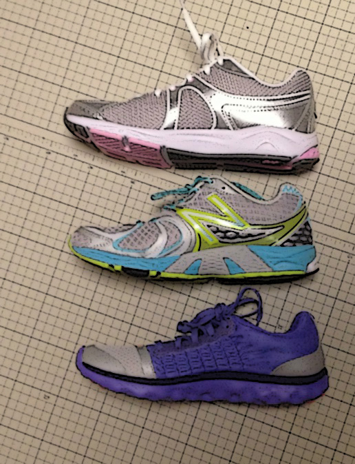 横から見た感じは、シルバーのほうは微妙に変わらない感じですが、パープルのほうは明らかに薄いです。同じ木型を使っていても素材や形等によりかなり履き心地に違いが出そうです。