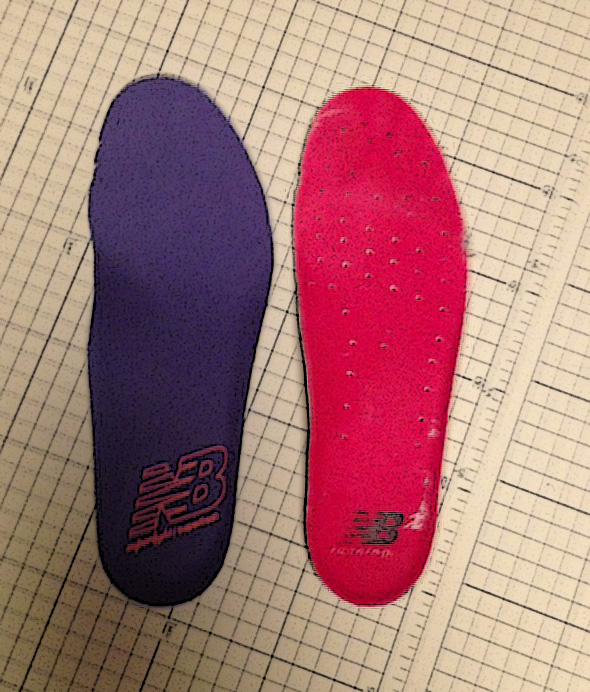 赤いほうが、B幅のスニーカーに入っていたインソール。紫のほうが今回の2Aのインソールです。インソールの見た目はあきらかに紫のほうが幅が広いです。ただ厚みは紫のほうが多くてしっかりしています。
